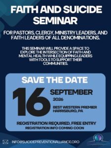 Save the Date: Faith and Suicide Seminar – Coming September 16, 2026. This seminar is for Pastors/Clergy/Ministers and Faith Leaders of all Denominations. This seminar will provide a space to explore the intersection of Faith and Mental Health that will equip faith leaders to support their communities, to prevent, and help those who lose loved ones to suicide.